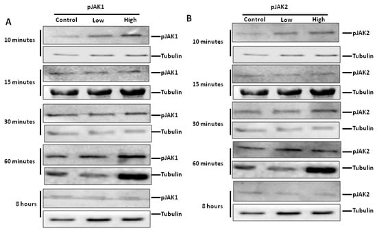 Given the comprehensive analysis of cell cycle and myogenic regulatory factors in C2C12 cells, further investigation using PHMs focused on the role played by JAK-STAT signaling in IL-6-mediated behavior of primary human myoblasts. PHMs were treated with low and high concentrations of IL-6 and evaluation of the signaling pathways activated was done. In PHMs, activation of the JAK-STAT signaling pathway was followed up to 8 h after addition of IL-6, through evaluation of p-JAK1, p-JAK2 and p-STAT3 levels. Time points included 10, 15, 30, 60 min and 8 h. Figure 9 presents results on some time points as well as the effects of IL-6 concentrations. Without IL-6, there were no changes in p-JAK1 or p-JAK2 at any time points.