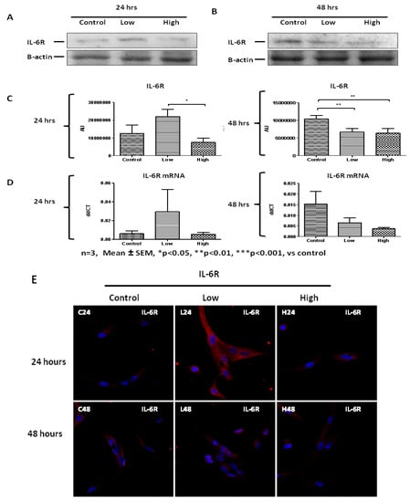 The transmembrane complex of IL-6 and its receptor IL-6R, allows IL-6 to bind to gp130 subunits of the receptor. Given the relatively long exposure of the PHMs to IL-6 in the media, an investigation was done on the effect of IL-6 on expression of IL-6 receptor in human primary cells. Indeed, IL-6R protein levels were altered by exposure to IL-6 (Figure 11). These alterations exhibited both positive feedback and downregulation at different times and with different concentrations of IL-6. At the 24 h time point western blot data show that low IL-6 concentration resulted in an upregulation of its receptor, IL-6R (Figure 11A,C). On the contrary, high IL-6 concentration resulted in no change in IL-6R (Figure 11A,C). After 48 h of incubation with IL-6, IL-6R levels were downregulated by treatment with both low and high IL-6 concentrations (Figure 11B,C). Thus, the upregulation of IL-6R protein was not sustained after 48 h at which time both concentrations had protein levels significantly below basal levels, probably indicating negative feedback (Figure 11A–C). RT PCR analysis of IL-6R transcripts also confirmed the results obtained via western blot indicating that this was an influence at the level of transcription factors (Figure 11D). Immunofluorescence data mirrored the protein data obtained (Figure 11E).