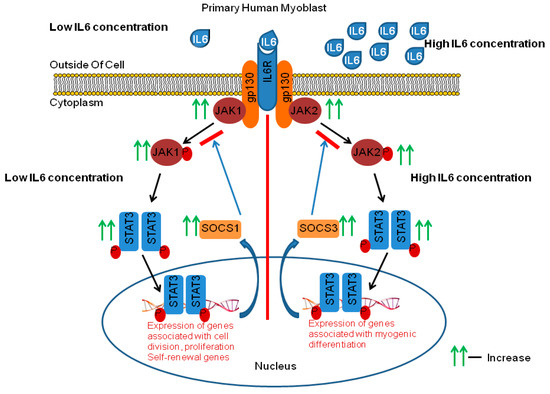 Therefore, the aim of this study was to evaluate the effect of physiologically relevant IL-6 concentrations on myoblasts’ proliferation, differentiation and the activation of the JAK-STAT pathway. Proliferating myoblasts, either C2C12 or of primary human origin, were treated with different IL-6 concentrations, and cell behavior at different time points was investigated. Based on our data, the main findings were that low IL-6 concentration induced proliferation of myoblasts as shown by increased proliferation markers such as proliferating cell nuclear antigen (PCNA)through JAK1 activation and feedback through SOCS1 expression. High IL-6 induced differentiation of myoblasts as shown by increased myogenin expression through JAK2 activation and increased SOCS3 expression. Increases in IL-6R at low IL-6 concentration were observed, possibly serving as a compensatory mechanism to increase binding of IL-6 to its receptor to increase signaling. At high IL-6, the decrease in IL-6R observed may serve a homeostatic role to reduce IL-6 signaling. Overall, these data imply that the concentration of IL-6 plays a major role in determining whether activated satellite cells respond to IL-6 by proliferating more or differentiating. Furthermore, a feedback loop exists whereby negative regulators such as SOCS1 and SOCS3 can abrogate the effect of IL-6-mediated increase in JAK-STAT signaling.
