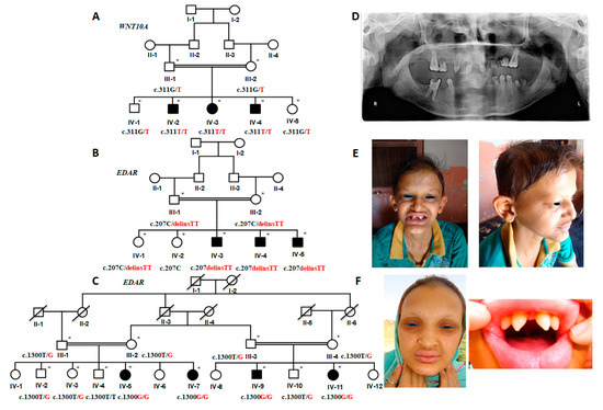 (A–C) Pedigrees of family A, B, and C show the autosomal recessive mode of inheritance. The available samples for the genetic analyses are marked with asterisks (*). The genotypes of each participant in these pedigrees are mentioned below the symbols, showing the segregation of the alleles. The black color represents the wild-type allele and red color depicts the disease-allele (D) Orthopantomogram (OPG) of the affected member (IV-2), family A, revealed the absence of the majority of permanent teeth, except maxillary first molars, maxillary central incisors, maxillary right canine, and mandibular left first and second premolars and mandibular right first premolar (teeth # 16, 26, 11, 21, 13, 34, 35 and 44, respectively, according to FDI nomenclature). (E,F) A male patient (IV-3) of family B and a female patient (IV-5) of family C are showing pigmentation around lips and eyes, sparse scalp hair, eye-brows, and eye-lashes, saddle-shaped nose, and characteristic canonical teeth.