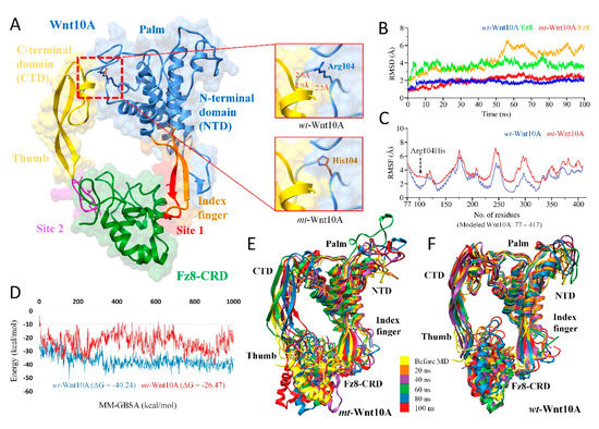 Structural analysis of WNT10A complexed with Fz8-CRD. (A) Overall structural representation of WNT10A in complex with Fz8-CRD followed by a close-up of interatomic interactions with a substitution of Arg104His in WNT10A. Ribbon representations of domains with distinct color as N-terminal index finger (brown), central palm (cauliflower) and C-terminal thumb (gold) domains, while Fz8-CRD is displayed in green. (B) RMSD trajectories of WNT10A Cα-backbone atoms of mutant (red) and wild-type (blue) complexed with Fz8-CRD throughout 100ns. (C) RMSF trajectories of mutant (red) and wild-type (blue). (D) MM-GBSA trajectories (total of 1000 snapshots from the 100ns MD simulations) of mutant (red) and wild-type (blue) (E,F). Structural conformations of WNT10A/Fz8-CRD obtained after 20ns, 40ns, 60ns, 80ns, and 100ns are superimposed together.
