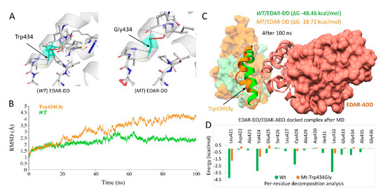 Structural analysis of EDAR complexed with EDARADD. (A) Interatomic interactions with a substitution of Trp to Gly at position 434 in EDAR. (B) RMSD trajectories of Cα-backbone atoms of mutant (brown) and wild-type (green) throughout 100ns. (C) Docked conformation of EDAR/EDARADD complex after 100 ns MD simulation, with exposed ribbon conformation of 5th α-helix of wt (green) and mt-EDAR (brown). (D) Per-residue decomposition analysis of 5th α-helix with the same color code as above.