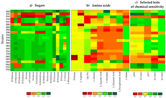 Heatmap of 23 strains showing physiological profiles for (a) sugars, (b) amino acids and (c) selected tests for chemical sensitivity after 120 h of incubation. The relative utilization of selected substrates is depicted by color intensity, based on the legend next to the figure. The highest consumption can be identified by a red color and the lowest consumption by a green color.