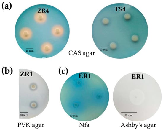 (a) The production of siderophores based on the formation of an orange zone around colonies on CAS agar after 72 h of incubation. Strain ZR4 presented positive production of siderophores, while strain TS4 show no production of siderophores. (b) Phosphate solubilizing by the ZR1 strain on Pikovskaya agar after 120 h of incubation. (c) Oligonitrotrophic bacteria ER1 on Nitrogen-free (Nfa) agar medium and Ashby’s mannitol agar (in zoom) after 72 h of incubation.