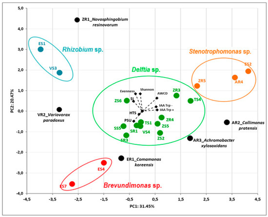 Biplot diagram of Principal Component Analysis (PCA), describing plant growth-promoting activities (IAA, HTS, PSU, SI) and biodiversity (Biolog GEN III) indices (AWCD, Shannon, Evenness) of 23 bacterial endophytes isolated from plants. Strains classified based on the nucleotide sequence of their 16S rRNA genes to the same genus are indicated in different colors.