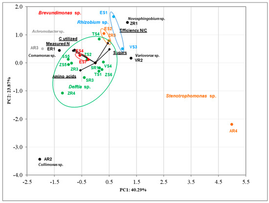 The correlation between tested bacteria using analysis of produced nitrogen, carbon utilized, efficiency N/C, and sugars and amino acids utilization was determined via Principal Component Analysis (PCA) (Figure 4). The results were in accordance with previous PCA. The clear cluster based on genus bacteria was noted. The first two dimensions of PCA explained 64.16% of the total variation, with principal component 1 (PC1) accounting for 40.29% and principal component 2 (PC2) accounting for 23.87% of the variance. The AR2 and AR4 strains are clearly different from the others.