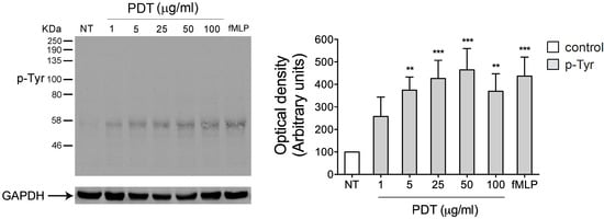 2.2. PTx Treatment Inhibits PDT-Induced Chemokine Activity and Tyrosine Phosphorylation-based Protein Signaling in Monocytes