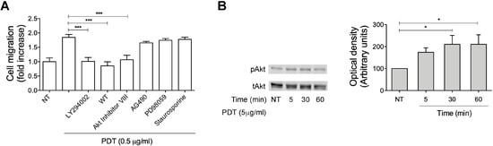 2.3. Monocyte Migration Triggered by PDT Requires the Activation of PI3K/Akt Signaling Pathway