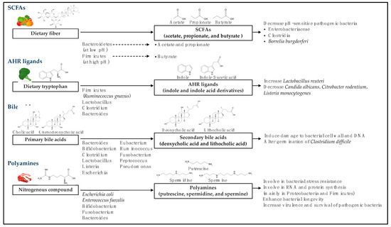 The presence of intestinal microbiota can indicate specific microbial metabolites and the consequent effects on the bacterial microbiome and host cells [15,16]. In this section we discuss the biotransformation of bioactive metabolites, SCFAs, aryl hydrocarbon receptor ligands, bile acids, polyamines, and others, the metabolite-specific intestinal microbiota, and the effect of each metabolite on the intestinal microbiome (Figure 1).
