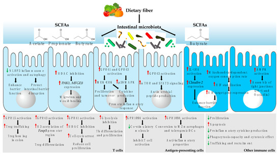The effect of SCFAs on the immune system, particularly the anti-inflammatory effect, has been shown by many studies [11,19]. SCFAs are physiological ligands for different GPRs, including GPR109A, GPR41, and GPR43, which are differentially expressed by various immune cell types, activating signaling cascades related to immune cell maturation and function [11,96,97,98]. Butyrate is a ligand of GPR109A that is expressed on macrophages, dendritic cells (DCs), neutrophils, ILCs, and T cells [99,100,101]. Propionate is a ligand of GPR41 and GPR43, whereas acetate is a ligand of GPR43; these two GPRs are expressed on monocytes, DCs, eosinophils, neutrophils, and T cells [102,103]. The activation of GPRs sequentially leads to a decrease in the production of pro-inflammatory mediators through different mechanisms. Butyrate inhibits HDAC and nuclear receptor peroxisome proliferator-activated receptor gamma, resulting in the reduction of pro-inflammatory cytokine expression mediated by nuclear factor kappa-light-chain-enhancer of activated B cells (NF-κB) [104,105,106]. In addition, SCFAs, and primarily butyrate, modulate the recruitment of immune cells to the intestinal tract, by controlling the expression of chemokines or chemoattractant receptors; for example, propionate and butyrate suppress leukocyte trafficking by reducing the production of several chemokines, including CCL3, CCL4, CCL5, CXCL9, CXCL10, and CXCL11, by human monocyte-derived DCs [97]. Acetate acts on GPR43 to decrease the expression of chemoattractant receptors, including C5aR and CXCR2, in neutrophils, resulting in the reduction of neutrophil recruitment to the intestinal tract [103]. SCFAs also promote the GPR15-dependent homing of Tregs in the colon [107]. Further, butyrate affects T cell proliferation in a concentration-dependent manner. T cell proliferation is stimulated by low butyrate levels (and inhibited by high butyrate levels), which might be related to alterations in cell cycle progression. This effect might be mediated by the interaction between butyrate and GPR41, followed by HDAC inhibition [108,109]. In addition, HDAC inhibition by butyrate induces the apoptosis of immune cells such as macrophages, neutrophils, mast cells, and T cells [109,110,111]. Furthermore, butyrate controls immune responses by modifying the function of antigen-presenting cells, such as reducing the expression of co-stimulatory molecules and inducing the anti-inflammatory properties of DCs and macrophages, which is mediated by GPR109A activation. This results in reduced pro-inflammatory cytokine production and Treg differentiation [112]. Lastly, SCFAs contribute to Treg differentiation by increasing histone H3 acetylation in the Foxp3 promoter region, which is mediated by GPR43 activation [113,114]. The overall effects of SCFAs on immune cells are summarized in Figure 2.