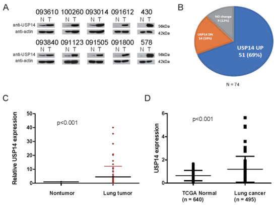 USP14 expression level in lung cancer tissues. (A) Representative immunoblot for USP14 and β-actin in 74 paired lung cancer tissues and their adjacent nontumor lung tissues (N, nontumorous, T, cancer tissue), (B) pie chart of USP14 expression using immunoblot analysis in 74 paired lung cancer tissues and nontumor tissues. β-Actin expression was used as an internal control, (C) USP14 expression levels in 74 lung cancer cases. P-values represent probabilities for USP14 expression levels between variable subgroups determined with two-sided Fischer’s exact test (tumor node metastasis), (D) expression levels of the USP14 gene in healthy individuals (Normal, n = 640) and patients with lung cancer (Tumor, n = 495) from the TCGA LUAD database. The box plot represents the mean expression of USP14 (±SD), and the horizontal line indicates the median value.