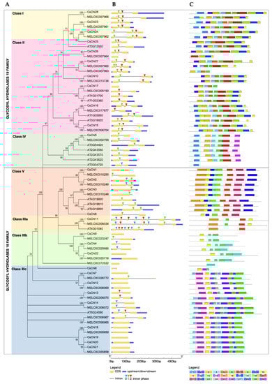 To study the structural conservation and diversity of chitinase genes, the exon-intron architecture and conserved motifs distribution was investigated. Most GH18 chitinase genes contained 1 or 2 exons, except for chitinases in the Class IIIa clade, which are SI-CLPs known for their large size and many exons (Figure 1B) []. Whereas, most GH19 chitinase genes had 3 exons. Closely related genes share high similarity in terms of the length, number of exons/introns and intron phases, and these features are highly conserved. Only 8 of the 17 CsChi genes belonging to the GH18 family contained introns, compared to 10 of 11 CsChi genes from the GH19 family. The absence of an intron region was most prevalent for chitinases in the Class IIIc clade. Most class I and II CsChi genes had 2 introns and uniform intron phases, while members of class IV had 1 intron. In addition, some intron loss or gain occurred within several evolutionary branches.