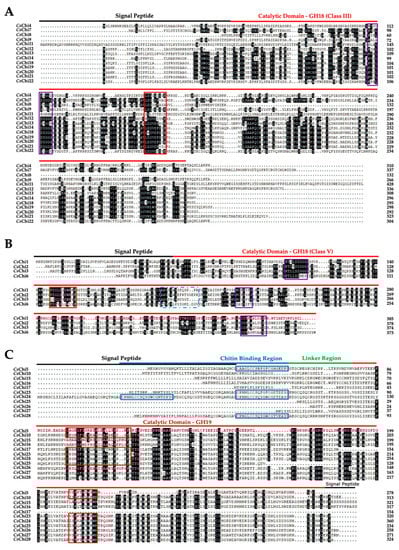 Multiple sequence alignment of the conserved domains of cucumber chitinase. (A) Sequence alignment of GH18 class III chitinases. Shaded amino acids are 50–100% homologous. (B) Sequence alignment of GH18 class V chitinases. Shaded amino acids are 75–100% homologous. (C) Sequence alignment of GH19 (class I, II and IV) chitinases. Shaded amino acids are 75–100% homologous. Amino acid sequences were aligned using DNAMAN software (ver. 6.0). Black and red lines over sequences indicate signal peptides and catalytic domain. While chitin-binding and linker regions are indicated by blue and green line over sequence. Purple boxed residues are conserved. Blue box (dash line) = PS00225, red box = catalytic domain and blue boxes = chitin-binding domain.