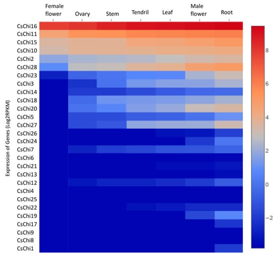 To gain insight into the functions of CsChi genes, RNA-seq data (NCBI accession number: PRJNA80169) from C. sativus L. var. sativus cv. 9930 were used to quantify the expression levels of chitinase genes in various tissues (leaf, stem, female flower, male flower, ovary, root, and tendril) []. The expression profiles of all 28 putative CsChi genes were visualized using heat maps (Figure 4). Four of the 28 genes were highly expressed in all tissues (CsChi10/11/15/16). Most chitinase genes exhibited consistent expression levels across all tissues with some genes not expressed or only weakly expressed in female flowers, ovaries, and stems. In contrast, several chitinase genes exhibited higher expression levels in their roots compared with the other tissues (CsChi2/15/10/20/23/27/28), suggesting that they may play a role against soil-borne pathogens.