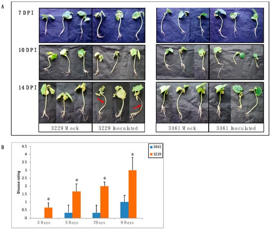 Fusarium wilt infection assay. (A) Disease symptoms of fusarium wilt in cucumber inbred lines 3229 and line 3461. The roots were inoculated with F. oxysporum f. sp. Cucumerinum Owen race 3. Mock plants were treated with distilled water. Red arrows show severe wilting in the stem. (B) Average disease symptom rating of both lines was scored using a disease rating scale (0–4). Values are shown as means ± SD (n = 6). (*, p < 0.05; Student’s t-test).