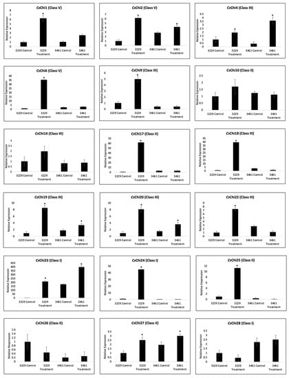 The expression pattern of each CsChi gene was checked 3dpi, as it has been reported that genes encoding several PR proteins showed a peak in expression 1-3dpi when distressed with hemibiotrophic pathogens [,,,]. In line 3229, expression analysis revealed that most chitinase genes responded significantly to fungal infection (Figure 6). Specifically, 14 genes were significantly up-regulated after infection, while 2 genes (CsChi26 and CsChi28) were down-regulated. In line 3461, the expression levels varied and 7 genes were up-regulated following fungal infection, 2 genes were down-regulated and no significant differences were observed in 9 genes. The expression of class I chitinase genes (CsChi23 and CsChi28) were generally higher in resistant lines. Interestingly, CsChi23 was constitutively expressed about 200-folds higher in line 3461 compared to line 3229 in mock infected plants.