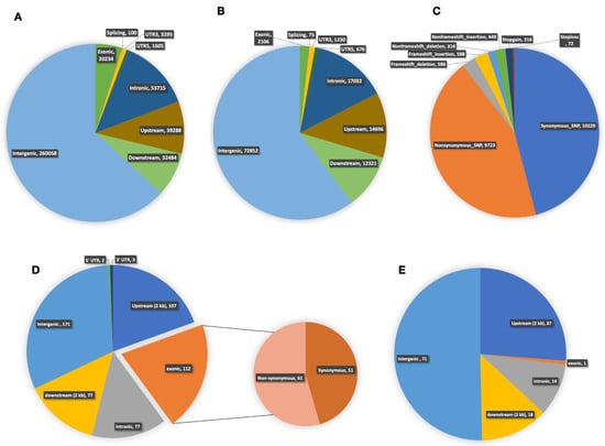 Annotation and distribution of single-nucleotide polymorphisms (SNPs) and insertions and deletions (InDels). Distribution of (A) SNPs; and (B) InDels in different genomic regions. (C) Annotation of total large-effect SNPs and InDels in different genic regions. Distribution of (D) SNPs; and (E) InDels in different intergenic and genic regions of chitinase genes from C. sativus lines 3229 vs 3461. The number of synonymous and non-synonymous SNPs detected within the CDS region has also been shown. Distribution of SNPs and InDels were 3229 vs 3461.