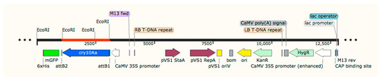Schematic representation of the plasmid pMDC85/cry10Aa. The 12,838 bp-long plasmid consists of the cry10Aa gene under 2XCaMV35S (cauliflower mosaic virus 35S promoter with a duplicated enhancer region) and 3′NOS (nopaline synthase terminator); HygR (hygromycin phosphotransferase) gene (hph) under 2XCaMV35S and 3′NOS terminator, mGFP (modified green fluorescent protein) under 2XCaMV35S promoter and 3′NOS terminator. 6xHis (6x histidine affinity tag); attB1-B2 (mutant version of attB); RB (right border repeat from nopaline C58T-DNA); pVS1 StaA (stability protein from Pseudomonas plasmid pVS1); pVS1 RepA (replication protein from Pseudomonas plasmid pVS1); Bom (bases of mobility region from pBR322); Ori (high-copy-number ColE1/pMB1/pBR322/pUC origin of replication); KanR (aminoglycoside phosphotransferase aphA-3, which confers kanamycin resistance); LB T-DNA repeat (left border repeat from nopaline C58 T-DNA); CaMV poly(A) signal (cauliflower mosaic virus polyadenylation signal); CAP binding site (E. coli catabolite activator protein); lac promoter (three segments) promoter for the E. coli lac operon; lac operator (laccase repressor encoded by lacI); and M13 rev. (common sequencing primer).