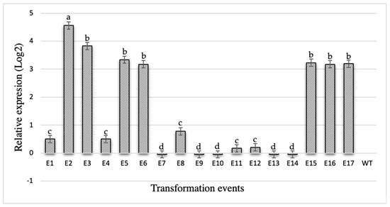 After normalization based on the expression of plant endogenous genes (actine, RP29, and 24S), qPCR analysis of cry10Aa transcript relative expression (Log2) in the leaves of the 17 transgenic plants and two wild-type control plants was carried out. Notably, event 2 (E2) presented the highest cry10Aa transcript expression level (4.56-fold), whereas other events (E1, E4, E8, E11, E12) presented the lowest expression levels (0.11, 0.5, 0.78, 0.17, 0.21-fold, respectively); eight events ranged from 3.22 to 3.87-fold; and no expression was observed in the WT plants (Figure 3).