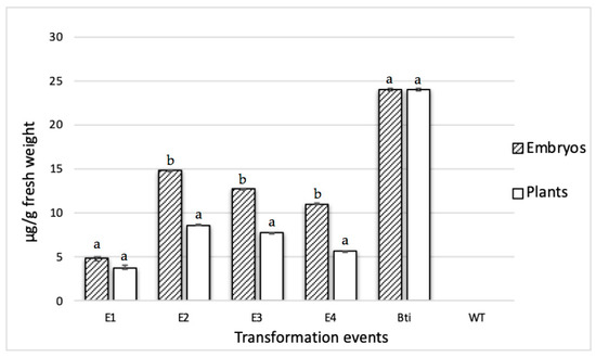 Cry10Aa protein immunodetection in transformed and wild-type coffee plants by ELISA. The primary antibody used in all experiments was the polyclonal anti-Cry10Aa. Total protein per well, 10 μg. Letters represent statistical significance (Student’s t-test) between embryos and leaves from each transformation event.