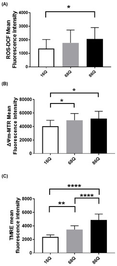 We measured intracellular ROS production; however, ROS production in HD neurons predominantly originates from mitochondrial dysfunction [49,50]. Therefore, we also verified mitochondrial status in our cellular models by staining the mitochondria with Mitotracker CXMRos and TMRE. Mitotracker CXMRos is a sensitive indicator of mitochondrial membrane potential changes and oxidative stress, while tetramethylrhodamine ethyl ester (TMRE) loads specifically into polarized mitochondria. In the case of TMRE, we also used a positive control to check the specificity of TMRE. The positive control was generated by treating cells with 20 µM FCCP (Carbonyl cyanide 4-(trifluoromethoxy)phenylhydrazone) to depolarize the mitochondria (Figure S1). FCCP disrupts ATP synthesis by transporting protons across mitochondrial inner membranes. It depolarizes mitochondrial membrane potential and eliminates mitochondrial membrane potential and TMRE staining. Therefore, it can be used as a control to ensure the mitochondrial specificity of the TMRE staining. As shown in Figure 1B,C, we detected a significant increase in mitochondrial membrane potential with both dyes in HD (68Q and 86Q) fibroblasts compared to the healthy (16Q) control.