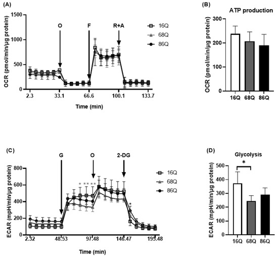 Another source of energy production in cellular metabolism is glycolysis. We measured glycolytic activity by monitoring extracellular acidification rate. We detected a significant decrease in glycolysis in 68Q HD fibroblasts compared to healthy (16Q) control (Figure 2C,D). The 86Q HD fibroblasts showed reduced glycolysis compared to healthy (16Q) control, but did not reach significant difference. Taken together, these data suggest that mitochondrial oxidative phosphorylation is maintained while glycolysis is suppressed in juvenile HD fibroblasts providing sufficient energy for cell survival.