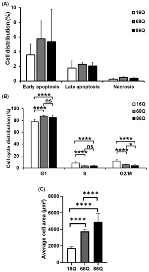 Cell cycle analysis was performed to examine whether fibroblasts derived from HD patients exhibit cell cycle perturbations as a possible cause for reduced proliferation. We assessed the percentage of cells in G0/G1, S, and G2/M phases. The analysis revealed that the percentages of HD (68Q and 86Q) fibroblasts in S and G2/M phases were significantly lower compared to the healthy (16Q) control, while a significantly higher percentage of HD fibroblasts were in the G0/G1 phase. These data indicate cell accumulation in G0/G1 before the progression of S phase and reduced mitosis in HD fibroblasts (Figure 3B).