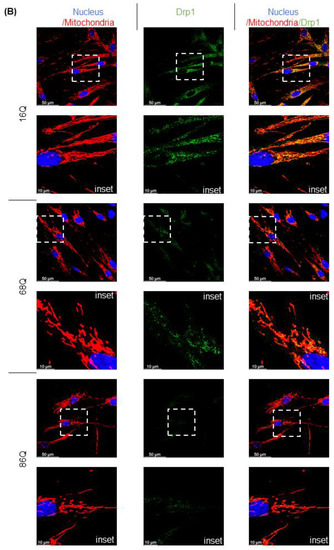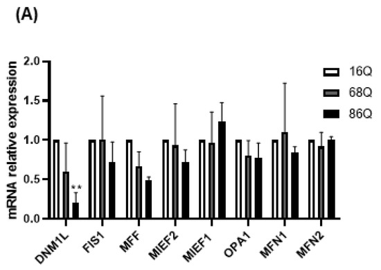 Mitochondrial function is also maintained by the mitochondrial fusion–fission process. Increased mitochondrial membrane potential might be associated with the altered fusion–fission machinery [20,51,52,53]. Thus, we explored the changes in mRNA levels for the mitochondrial fusion protein genes, OPA1 (Opa1), MFN1 (Mitofusin-1), and MFN2 (Mitofusin-2), and the mitochondrial fission protein genes, MIEF1 (Mid51), MIEF2 (Mid49), FIS1 (Fis1), DNM1L (Drp1), and MFF (Mff), in HD fibroblasts. We found that the mRNA expression of the mitochondrial fission protein Drp1 was significantly lower in HD fibroblasts expressing the 86 polyQ repeats relative to the healthy control (Figure 4A).