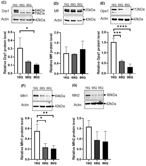We also evaluated protein levels for a subset of mitochondrial fusion–fission proteins by Western blot, and by fluorescent confocal microscopy for Drp1. Interestingly, our results revealed that Drp1 protein level was lower in both models of HD (68Q and 86Q) fibroblasts compared to the control (16Q) and reached significance in 86Q similar to the mRNA expression data (B,C), while Mff did not show significant changes (D). Protein levels for the mitochondrial fusion proteins, Opa1 and Mfn1 were significantly lower in HD fibroblasts compared to the control (E–G). Taken together, the data suggest that the mitochondrial fusion–fission machinery is affected in our model of HD fibroblasts.