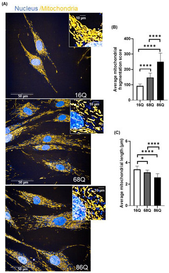 Emerging evidence suggests that Huntington’s disease is associated with an increased production of reactive oxygen species (ROS), which participate in neuronal cell death predominantly in the striatum and cortex [45,46,47,48]. Cellular dysfunction in peripheral tissues has not yet been fully studied. Thus, we compared intracellular ROS in skin primary fibroblasts from a healthy (16Q) patient and juvenile HD (68Q and 86Q) patients using carboxy-H2DCFDA. Interestingly, we found significantly elevated cytosolic ROS in fibroblasts with 86 polyQ repeats compared to healthy (16Q) control, which indicates existing oxidative stress in our juvenile HD fibroblast model (Figure 1A).