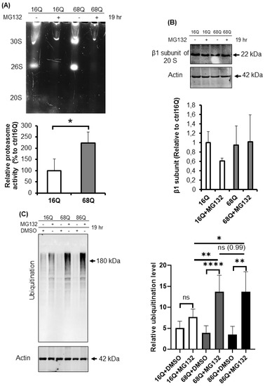 The 20S proteasome capped with the 19S regulatory particle(s), called the 26S for singly and 30S for doubly capped proteasomes, mediate ATP- and ubiquitin-dependent substrate degradation. As shown in Figure 6A, we detected higher chymotryptic-like activity of the 26S and the 30S proteasomes in HD patient-derived fibroblasts. Therefore, we investigated the ubiquitination of proteins from total cell lysates. Ubiquitinated protein levels were significantly higher in HD fibroblasts following proteasome inhibition by MG132 compared to the healthy control (Figure 6C).