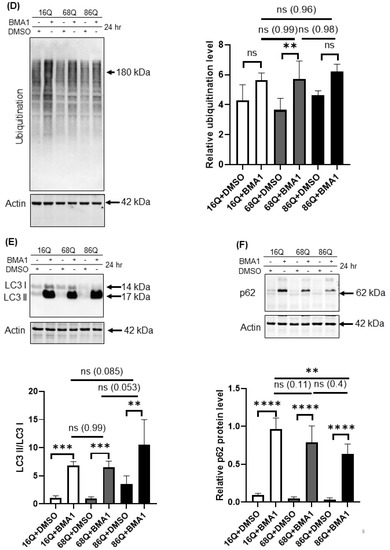 Autophagy is the other important recycling process to eliminate damaged or long-lived proteins. Thus, we checked the level of ubiquitinated proteins following autophagy inhibition with bafilomycin A1. We found that inhibition of autophagy slightly increased the ubiquitinated protein pool in HD fibroblasts similar to healthy control (Figure 6D). Using Western blot analysis, we measured protein levels for the autophagy markers, LC3 I and II and p62, in the presence or absence of bafilomycin A1. LC3 II is required for the formation of autophagosomes and can be used as a quantitative marker of autophagy [57] We found that bafilomycin A1 similarly and significantly increased the level of LC3 II in both, HD fibroblasts and healthy control compared to their respective vehicle treated control (Figure 6E). As a substrate for autophagy, p62 is also a marker for autophagy activity [58]. Western blot analyses revealed that autophagy is active and does not show major alteration in 68Q HD fibroblasts compared to healthy control according to the similar accumulation of p62 following inhibition of autophagy by bafilomycin A1 (Figure 6F). As for 86Q HD fibroblasts, we detected active autophagy pathway, but significantly less p62 following autophagy inhibition compared to the bafilomycin treated healthy control (Figure 6E,F).