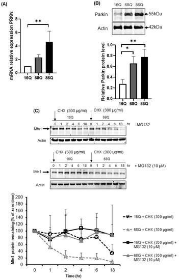 Parkin is an E3 ubiquitin ligase with protective cellular functions. Parkin is also involved in proteasomal-mediated protein turnover, mitochondrial function, and cell survival [59,60,61]. We speculated that the increased level of ubiquitinated proteins following proteasome inhibition and maintained cell viability in HD fibroblasts might also be associated with elevated parkin levels. We investigated the mRNA and protein expression level of parkin in control and juvenile HD fibroblasts. Our data indicate elevated mRNA in both HD and significantly higher mRNA in 68Q fibroblasts and significantly higher protein level in both HD (68Q and 86Q) fibroblasts compared to the control (16Q) (Figure 7A,B).