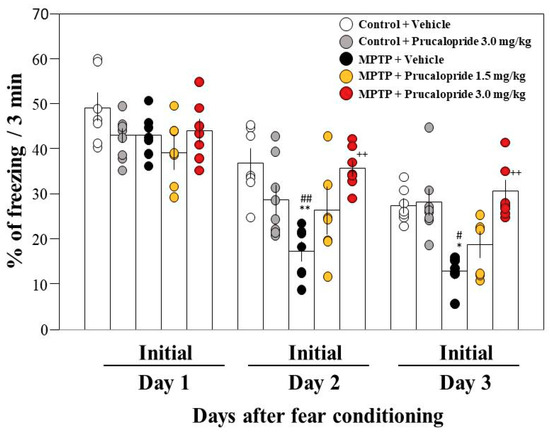 Effects of prucalopride on contextual fear extinction in mice. Mice were given an intraperitoneal injection of prucalopride at a dose of 1.5 or 3.0 mg/kg in saline containing 1% dimethyl sulfoxide (DMSO) or the vehicle only 2 h prior to both extinction training sessions. Data are expressed as the mean ± SEM; n = 7–8. * p < 0.05 and ** p < 0.01 vs. control + vehicle on each day, ++ p < 0.01 vs. MPTP + vehicle on each day, # p < 0.05 and ## p < 0.01 vs. control + prucalopride on each day (one-way analysis of variance (ANOVA) followed by Tukey’s post-hoc test). MPTP: 1-methyl-4-phenyl-1,2,3,6-tetrahydropyridine.