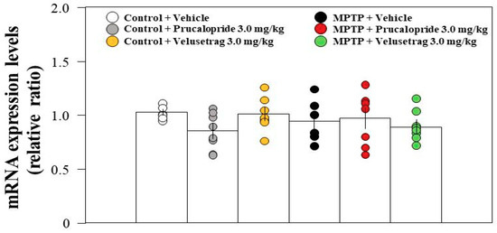 5-HT4R is highly expressed in the hippocampus [13]. The expression of 5-HT4R has been reported to be altered in a rodent model of PD [21]. Therefore, we examined the hippocampal messenger RNA (mRNA) expression level of 5-HT4R in PD mice and whether administration of 5-HT4R agonists would alter mRNA expression levels using RT-qPCR. The results showed that hippocampal mRNA expression levels of 5-HT4R were not significantly different between control and PD mice or among all groups, even after the administration of the 5-HT4R agonists (Figure 3).