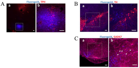 Mice were anesthetized with anesthesia containing medetomidine (3 µg/10 g body weight, i.p.; Zenoaq, Koriyama, Japan), midazolam (40 µg/10 g body weight, i.p.; Astellas Pharma Inc., Tokyo, Japan), and butorphanol (50 µg/10 g body weight, i.p.; Meiji Seika Pharma, Tokyo, Japan), and placed in a stereotaxic apparatus. FG (Setarch Biotech, LLC, Eugene, OR, USA) was dissolved in sterile saline to make a 2% FG solution, and 0.1 L of the FG solution was injected into the MnRN (4.5 mm posterior to the bregma and 4.7 mm below the surface of the skull) using a 10-µL microsyringe (Ito, Fuji, Japan). Three days after FG injection, the mice were intracardially perfused with ice-cold PBS followed by 4% paraformaldehyde in PBS under isoflurane anesthesia. The brains were post-fixed and sectioned (40-µm thick) as described above. In case of further analysis of fluorescent immunohistochemistry, the sections were then permeabilized with 0.5% (v/v) Triton X-100 in PBS (T-PBS) for 1 h, blocked in Block Ace (1:100 in T-PBS; KAC Co., Kyoto, Japan) for 1 h, and incubated for 24 h at 4 °C in mouse anti-tyrosine hydroxylase (TH) (1:5000 in T-PBS; Merck Millipore, Burlingame, CA, USA), mouse anti-glutamic acid decarboxylase 67 (GAD67) (1:5000 in T-PBS; Sigma-Aldorich, St. Louis, MO, USA), or mouse anti-tryptophan hydroxylase (TPH) (1:5000 in T-PBS; Merck Millipore). The sections were rinsed in T-PBS and incubated for 2 h at 4 °C in Alexa Fluor® 568 goat anti-mouse IgG (1:5000 in T-PBS; Thermo Fisher Scientific). The sections were rinsed in PBS, and then, mounted with mounting medium (Vectashield; Vector Laboratories) and coverslipped. Images were analyzed by a confocal laser-scanning microscope (C2+; Nikon).