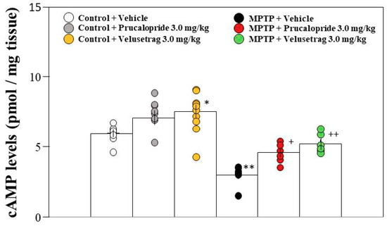Administration of the 5-HT4R agonists to PD mice restored the decrease in cyclic adenosine monophosphate (cAMP) levels in the hippocampus. Mice were given an intraperitoneal injection of prucalopride or velusetrag at a single dose of 3.0 mg/kg in saline containing 1% DMSO or the vehicle only 2 h prior to both extinction training sessions. The hippocampus was collected immediately after the second extinction training. cAMP levels are shown as pmol/mg of trichloroacetic acid (TCA)-precipitated tissue. Data are expressed as the mean ± SEM; n = 7–8. * p < 0.05 and ** p < 0.01 vs. control + vehicle, + p < 0.05 and ++ p < 0.01 vs. MPTP + vehicle (one-way ANOVA followed by Tukey’s post-hoc test).