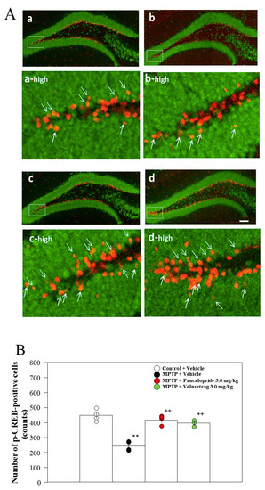 2.5. Administration of the 5-HT4 Serotonin Receptor Agonists to PD Mice Restored the Decrease in the Number of Phosphorylated CREB (p-CREB)-Positive Cells in the Hippocampal Dentate Gyrus (DG)