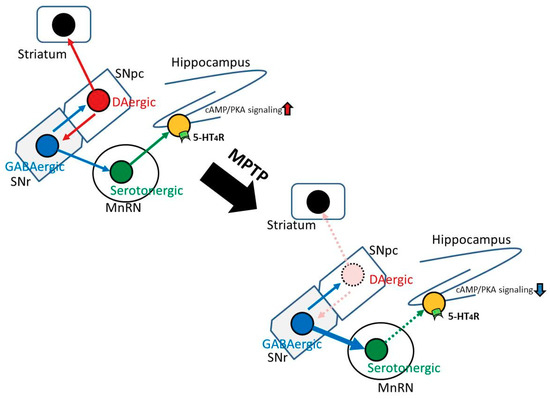 Serotonergic neurons in the MnRN, which project to the dorsal hippocampus, are impaired in patients with PD [18,19]. We considered the possibility that the degeneration of SNpc DAergic neurons in PD mice may indirectly lead to dysfunction of serotonergic neurons in the MnRN, resulting in an influence on hippocampal function. Therefore, we examined neuronal inputs to serotonergic neurons in the MnRN from the substantia nigra (SN). Figure 4 shows that GABAergic neurons in the SNr, but not DAergic neurons in the SNpc, project their neuronal terminals towards the MnRN serotonergic neurons. The results obtained from our retrograde tracing experiment were identical to those from a trans-synaptic tracing technique using modified rabies viruses [22]. These findings imply that the degeneration of SNpc DAergic neurons might affect GABAergic neurons in the SNr close to the SNpc, which in turn, may influence serotonergic neurons in the MnRN receiving GABAergic neurons from the SNr, resulting in hippocampal dysfunction (Figure 7). On the other hand, mRNA expression levels of 5-HT4R were not significantly different between control and PD mice (Figure 3). Therefore, the reduced impulse derived from MnRN serotonergic neurons may lead to reduced cAMP/CREB signaling in the hippocampal DG without affecting the expression levels of 5-HT4R, resulting in the facilitation of the memory extinction.