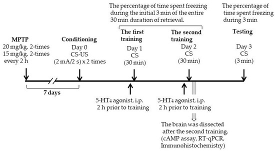 The serotonin 5-HT4 receptor (5-HT4R), a Gs protein-coupled receptor, is implicated in pathophysiological events such as depression, anxiety, and cognitive impairment, as well as memory loss in Alzheimer’s disease and a variety of physiological functions [10,11,12]. The 5-HT4R is highly expressed in the hippocampus [13], and 5-HT4R stimulation leads to increased hippocampal pyramidal cell activity and serotonin release in hippocampal slices [14]. Indeed, the administration of 5-HT4R agonists affects both behavioral and biochemical responses, such as an increase in CREB phosphorylation in the hippocampus, and results in the improvement of several pathophysiological events [15,16,17]. On the other hand, it has been reported that serotonergic neurons in the median raphe nucleus (MnRN), which project to the dorsal hippocampus, are impaired in patients with PD [18,19]. In the present study, to investigate whether hippocampal 5-HT4R is involved in the facilitation of memory extinction observed in PD mice, we examined the effects of the 5-HT4R agonists prucalopride and velusetrag on contextual fear extinction in PD mice. Moreover, we examined the presence of neuronal projection from the substantia nigra (SN) to the MnRN, the serotonergic neurons of which are known to project to the dorsal hippocampus, in consideration of a candidate neuronal pathway from the SN to the hippocampus [20].