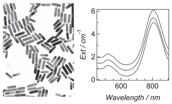 Representative TEM of synthesized gold nanorods. And optical extinction spectra of cetrimonium-terminated 15, CAI- and 2-methoxyethylamine conjugated particles 16 and 17 in aqueous suspensions, respectively, from bottom to top [21].