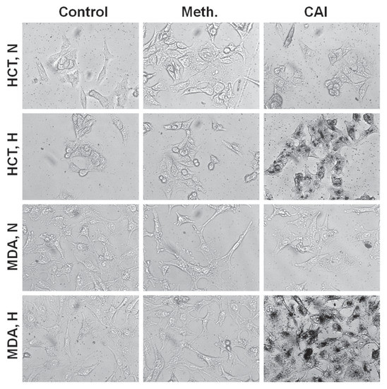 350 μm × 250 μm Optical micrographs of HCT or MDA cells in normoxia (N) and hypoxia (H), treated without particles (Control) or with 100 μM of CAI-terminated particles 16 or 2-methoxyethylamine- (Meth.) 17 and finally stained with silver [21].