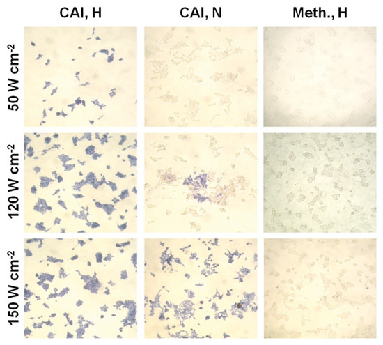 The SPR-induced effects of the synthesized coated nanorods on HTC cell cultures was assessed both under normoxic and hypoxic conditions. The SPR was induced by using a NIR radiation at 810 nm with a 5 min exposure time and power densities comprised between 50 and 150 W/cm2 (Figure 4).