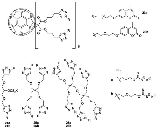 Research works have also been described with other multivalent platforms bearing different types of CA inhibitor chemotypes. Xanthate and coumarin chemotypes were, respectively, described as multimeric CAIs by Vincent group using respectively fullerene platforms 23 and polyol-scaffolds 24–26 (Figure 5) [27,28]. These multivalent systems were elaborated using the click-type copper-mediated azide-alkyne cycloaddition (CuAAC) reaction, as shown in Figure 5. The multivalent systems were in each case, better inhibitor than the monovalent inhibitor, but the weak multivalent effect was observed. However, both studies showed that the multimeric presentation of the CAIs can influence the selectivity against the different isoforms (cytosolic vs. membrane bounds). In the case of polyol-scaffold bearing xanthate chemotypes, weak inhibitory activity (micromolar range) and weak multivalent effects were observed. Nevertheless, improved potency and selectivity were noticed compared with the monovalent analogs [27,28]. The most important results in this work were the demonstration that inactive monovalent inhibitors on hCA II and hCA IX (inhibition constant >100 μmol) can become active when they are ligated on a multimeric platform, with inhibitory activity ranging from 10 to 70 μmol.