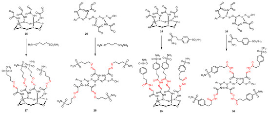 In 2017, our group reported new multimeric CAIs using functionalized peptide scaffolds as a multivalent platform [29]. We constructed cyclic and linear peptides bearing multiple reactive glyoxylic aldehyde functions able to be conjugated chemoselectively with sulfonamide inhibitors under mild conditions and in high yields using metal-free click-type bioconjugation methodologies such as hydrazone and oxime ligations (Figure 6).