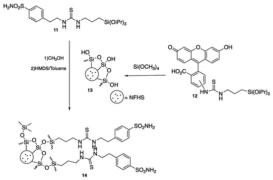 In the continuity of our work on nanoparticle-type platforms, we reported in 2015, the design and the synthesis of multivalent nanometer-sized fluorescent hybrid silica (NFHS) decorated with sulfonamide carbonic anhydrase inhibitors. [14] They were prepared by grafting silylated inhibitor ligand 11, on the fluorescent silica nanoparticle 13 previously obtained by co-hydrolysis and polycondensation of the fluorescent silylated precursor 12 and tetramethoxysilane under basic catalysis (Scheme 3) [14]. NFHS 14 with a diameter of about (3.5 ± 0.8) nm were characterized as non-porous, and the evaluation of the number of sulfonamide ligands was estimated between 12 and 14.