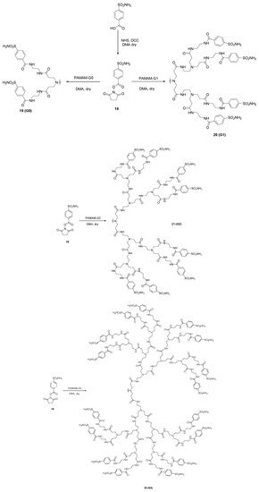 The synthetic chemistry approach applied is depicted in Scheme 4 and is based on amide coupling reactions between the G0–G3 dendrimeric terminal primary amines with the freshly prepared N-hydroxysuccinimide (NHS)-activated carboxylic ester of the phenyl sulfanilamide 18.