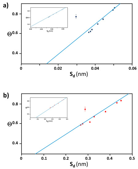 Our first instinct was that Θ was dominated by the molecular interaction between gold surface and peptide’s terminus responsible for an electrostatic interaction. Therefore, the surface field reflecting from the surface curvature would be proportional to molecular interaction and may influence the surface interaction and coverage. However, by assuming that simple term of curvature is proportional to an inverse of radius, we did not see any correlation between a curvature and Θ, as also implied by the complex relationship between Θ and d shown in Figure 4. This implies that at least obvious chemical interaction does not explain the intrinsic reasoning of Θ and its nano-size dependence. While no correlation between the gold colloidal size and its coverage ratio of peptide (Θ) was found in our study, we attempted to find justification of Θ for a given nano-size of gold colloid by using a mathematical approach without involving intermolecular forces. The most simplified explanation of higher or lower coverage is gained from calculating how much space is wasted by a given unit adsorbent. However, the coverage ratio cannot be simply predicted as a function of surface area. For example, if the area to be covered increases, the unit area of an adsorbent may not utilize given space without leaving an unoccupied area, and so the coverage ratio may not increase. The equatorial belt area was used as an index of the effectiveness of space usage, and the spacing between each prolate (Sd) should be correlated with the coverage ratio (Θ). For example, a prolate of Aβ1–40 (a = 1.4 nm and b = 2.2 nm) covering a 40 nm (d = 40.6 nm) has Θ = 0.86), and 100 nm (d = 99.5 nm)has Θ of 0.20. When maximum prolate with dimension of (a = 1.4 nm and b = 2.2 nm) was distributed equatorial belt of each gold colloid, Sd = 0.051 nm for 40 nm with neq = 50 and Sd = 0.012 nm for 100 nm with neq = 175 demonstrating that the larger the Sd, the higher the Θ. A clear correlation between Θ and Sd was confirmed for Aβ1–40 and α-syn as shown in Figure 7a,b as a positive slope for β2m as shown in Figure 7c as a negative slope. The finalized fitting parameters and fitting procedures will be further detailed in a report by Yokoyama and Ichiki [54].