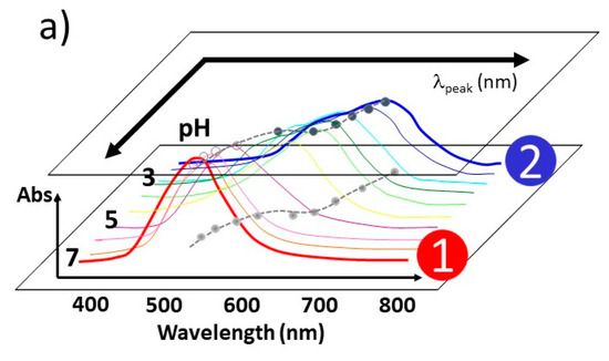 Then, the average peak position was surveyed as a function of pH, and the position of the peaks were plotted as a function of pH, as shown in Figure 12b. The constructed sigmoidal plot was then analyzed and fit with a Boltzmann formula (Equation (1)) as shown in Figure 12b.
