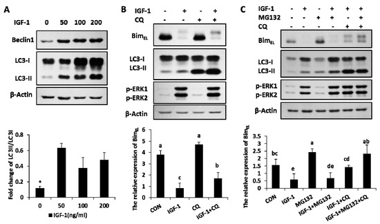 2.3. IGF-1 Induced Autophagy and Blocking Autophagy Flux Caused Accumulation of Phosphorylated BimEL